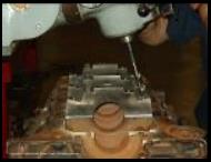 We start with extensive preparatory machining of the engine block to install splayed main caps from Kennedy Diesel. These caps relocate the outer bolts of the center three main caps (see photo at left). The bolt stress is now distributed into the block rail rather than in the undercut web area to eliminate a common web cracking failure mode through the outer bolt holes. After align bore and align hone, a Block True fixture is used to machine the deck surfaces. This ensures that the decks are perpendicular to each other and 45° from a line passing through the crank and cam centerlines. The final deck height is established in conjunction with the rod length to set the piston protrusion to the desired level (see photo at left). The block is then bored and torque-plate honed to the optimum piston-to-bore clearance. The crank shaft is ground to ensure perfectly aligned main journals and perfectly indexed rod journals. This usually can be accomplished with only 0.010” undersize journals resulting. The crankshaft and reciprocating hardware is then balanced to within 0.02 oz-in per plane (see photo at left). The connecting rods are reconditioned and machined to equalize their lengths. |